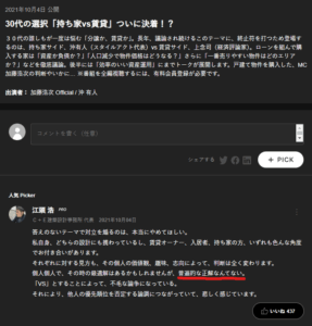 如果你問我, 到底哪個好或是該怎麼選, 我個人的回答是: 只要適合你的lifestyle, 讓你感覺到幸福的, 那個就是好的, 真的沒有一個標準答案. 而在節目網站的留言板得到最多讚的人也有類似的留言(下圖)…在日本工作就職或唸書, 除非公司有提供宿舍, 或是住在比較鄉下的地方, 租金比較不會那麼有感, 似乎一直租著下去也沒差到哪, 另一方面如果住首都圈, 就覺得房租負擔重..趕快自己買一間來住比較划得來..然而買房實屬人生重大決定之一, 不是說買就馬上買得了, 買得起..需要全面審視自己的職涯, 財務狀況, 生活模式, 市場狀況, 經濟局勢等..最後, 如果你有計畫在日本買房, 可以參考這一篇文章..