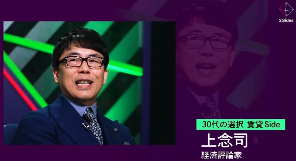 (1) 現在的時局(經濟危機)有太多太大的變化, 而且日本安定的終身雇用也逐漸崩壞, 所以用租房來應對比較安全..除此之外, 個人生涯規劃如轉職, 創業或是因為公司異動也是來賓贊成租房的觀點.